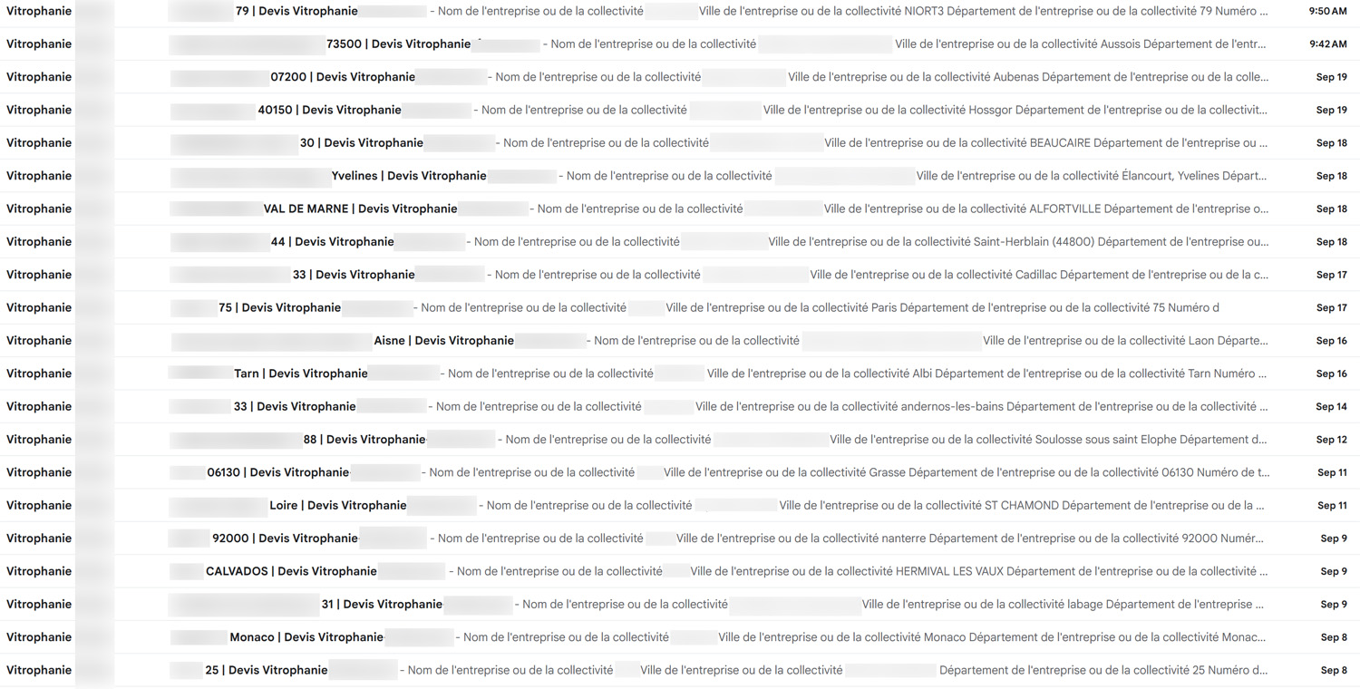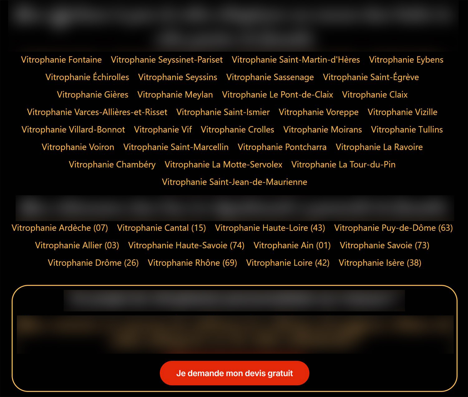 We deployed a “Our Services” section using the WPCityPages WordPress plugin. Since window decals are primarily a B2B service, we targeted municipalities with over 7,000 inhabitants across France, excluding overseas territories and Corsica (areas our business partner does not serve). This resulted in a total of about 1,500 pages. For monetization, we placed calls-to-action (CTAs) directing users to the quote request form on every generated city and department page.