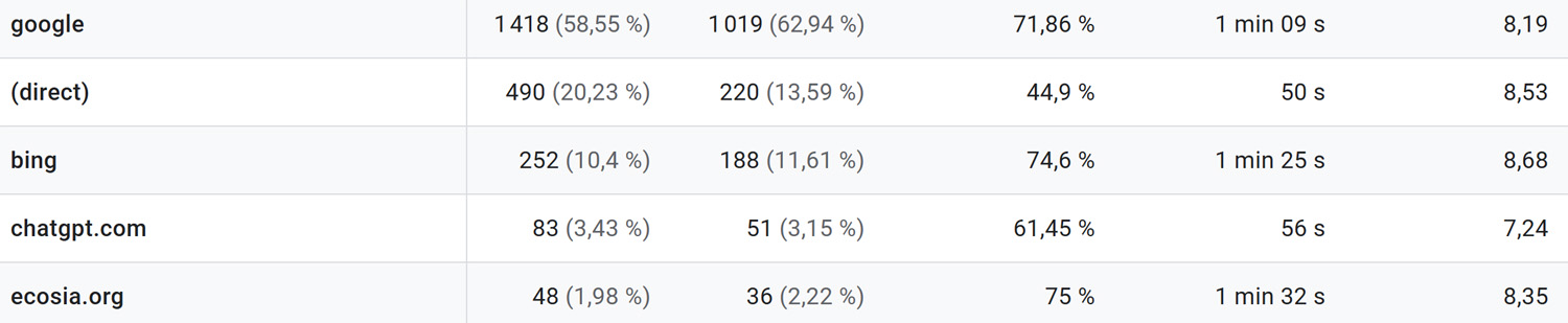 In the first 8 months after launching this window decal site, the average daily traffic from Google has been between 5 and 10 clicks. We are also seeing a gradual increase in visits from the Bing search engine. It’s important to note that this is a highly niche topic with low search volume. The site has also received visits from Ecosia, Qwant, Yahoo, and Chat GPT.